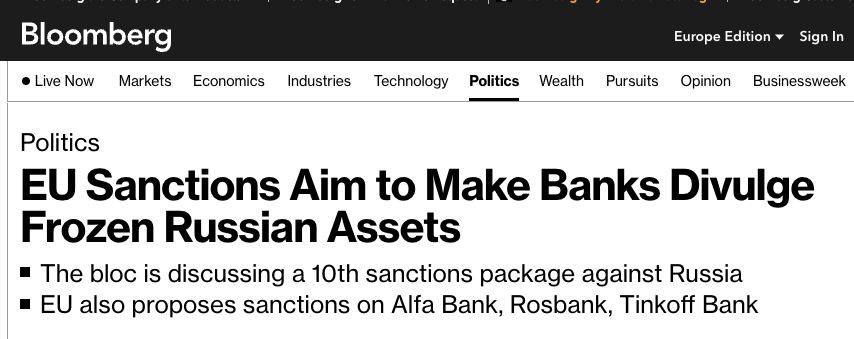 15:00 Накануне официального объявления проекта десятых санкций Евросоюза сразу ряд западных изданий сообщал, что в документе могут появиться ограничения против нескольких российских банков: Альфа-Банка, Тинкофф Банка и Росбанка.