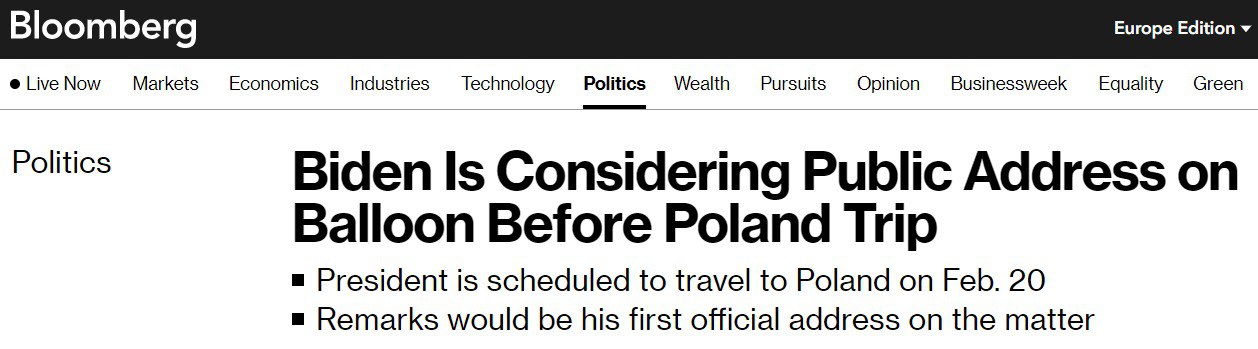 При этом агентство пишет, что Байден рассматривает возможность публичного выступления по теме аэростата перед поездкой в Польшу, запланированной на 20 февраля.