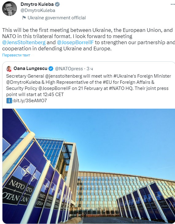 Генсек НАТО Йенс Столтенберг, главный дипломат ЕС Жозеп Боррель и министр иностранных дел Дмитрий Кулеба 21 февраля встретятся в Брюсселе. Об этом сообщает пресс-служба военного Альянса.