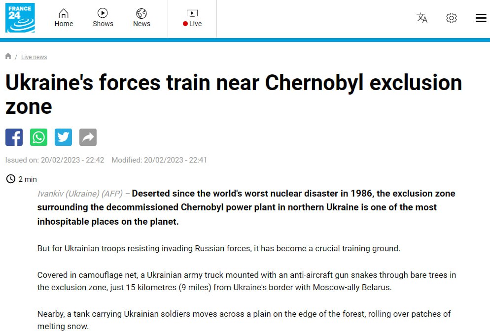 "Покрытый камуфляжной сеткой грузовик украинской армии с зенитным орудием пробирается сквозь голые деревья в зоне отчуждения всего в 15 километрах от границы Украины с союзной Москвой Беларусью. Рядом танк с украинскими солдатами движется по равнине на опушке леса, перекатываясь по пятнам тающего снега. По сигналу группа солдат начинает учебную атаку и направляется к лесу", - описываются действия военных в материале.