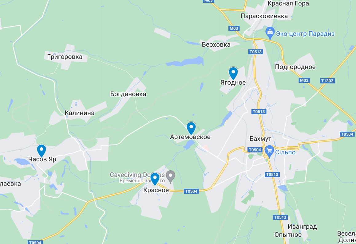 О боях за Хромово (на карте ниже - Артемовское) ранее не сообщалось. Дорога на Часов Яр, которая проходит через этот поселок, является ключевой для удержания Бахмута (трасса на Константиновку через Ивановское плотно простреливается россиянами, на ней подорван мост).