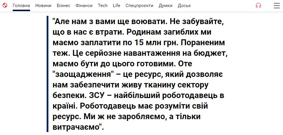 "Нам с вами еще воевать. Не забывайте, что у нас есть потери. Семьям погибших мы должны заплатить по 15 млн грн. Раненым тоже. Это серьезная нагрузка на бюджет, должны быть к этому готовы. Это "сбережение" – это ресурс, который позволяет нам обеспечить живую ткань сектора безопасности. ВСУ – крупнейший работодатель в стране. Работодатель должен понимать свой ресурс. Мы же не зарабатываем, а только тратим", - заявил министр.