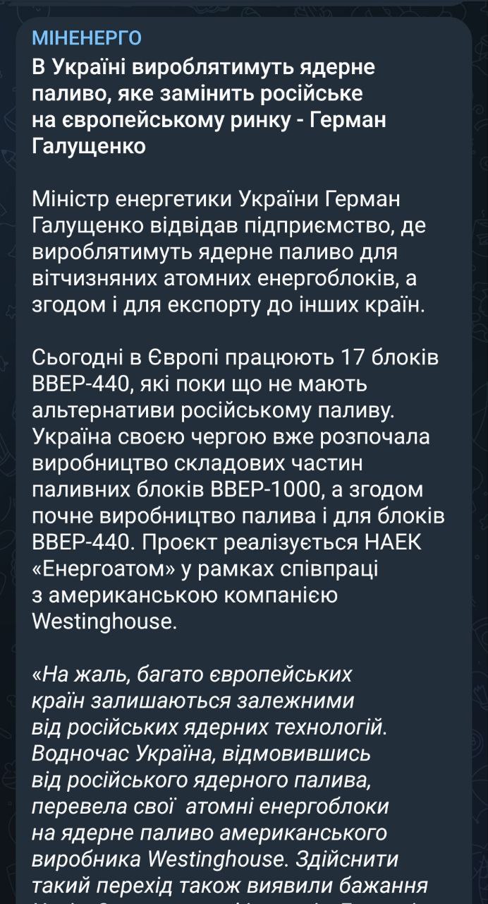 08.40 В Украине будут производить ядерное топливо, которое заменит российское на европейском рынке. Об этом заявил министр энергетики Герман Галущенко.