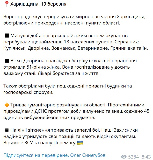 Об этом сообщает глава Харьковской ОВА Олег Синегубов в телеграм-канале.