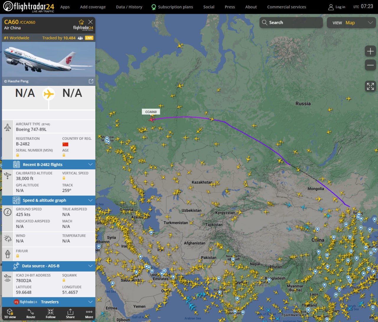 09.40 Самый активно отслеживаемый борт на Flightradar - cамолет CA60, на борту которого глава КНР Си Цзиньпин летит в Москву. За ним следят более 10 тысяч человек.