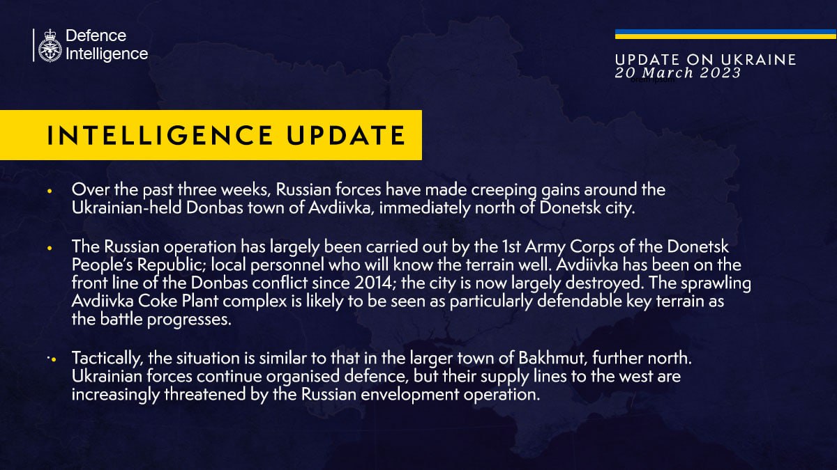 10.05 Последние три недели силы РФ постепенно продвигаются вокруг Авдеевки, ключевой территорией грядущих боев станет Авдеевский коксохим, сообщает разведка Великобритании.