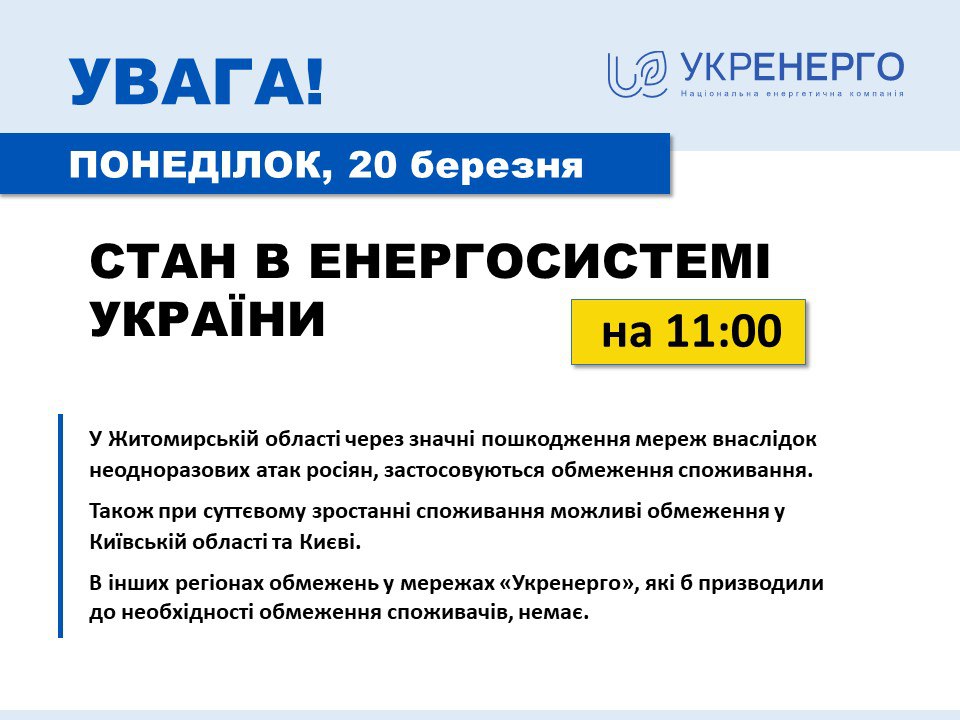 11.05 В Житомирской области из-за значительных повреждений сетей применяются ограничения потребления. Также возможны в случае роста потребления ограничения в Киеве и Киевской области, сообщает Укрэнерго.