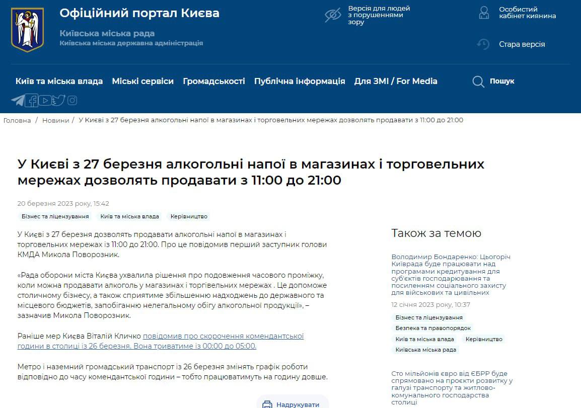 14:05 Глава военной администрации Киева Сергей Попко подписал указ о сокращении комендантского часа в столице с 26 марта - с 00:00 до 05:00.