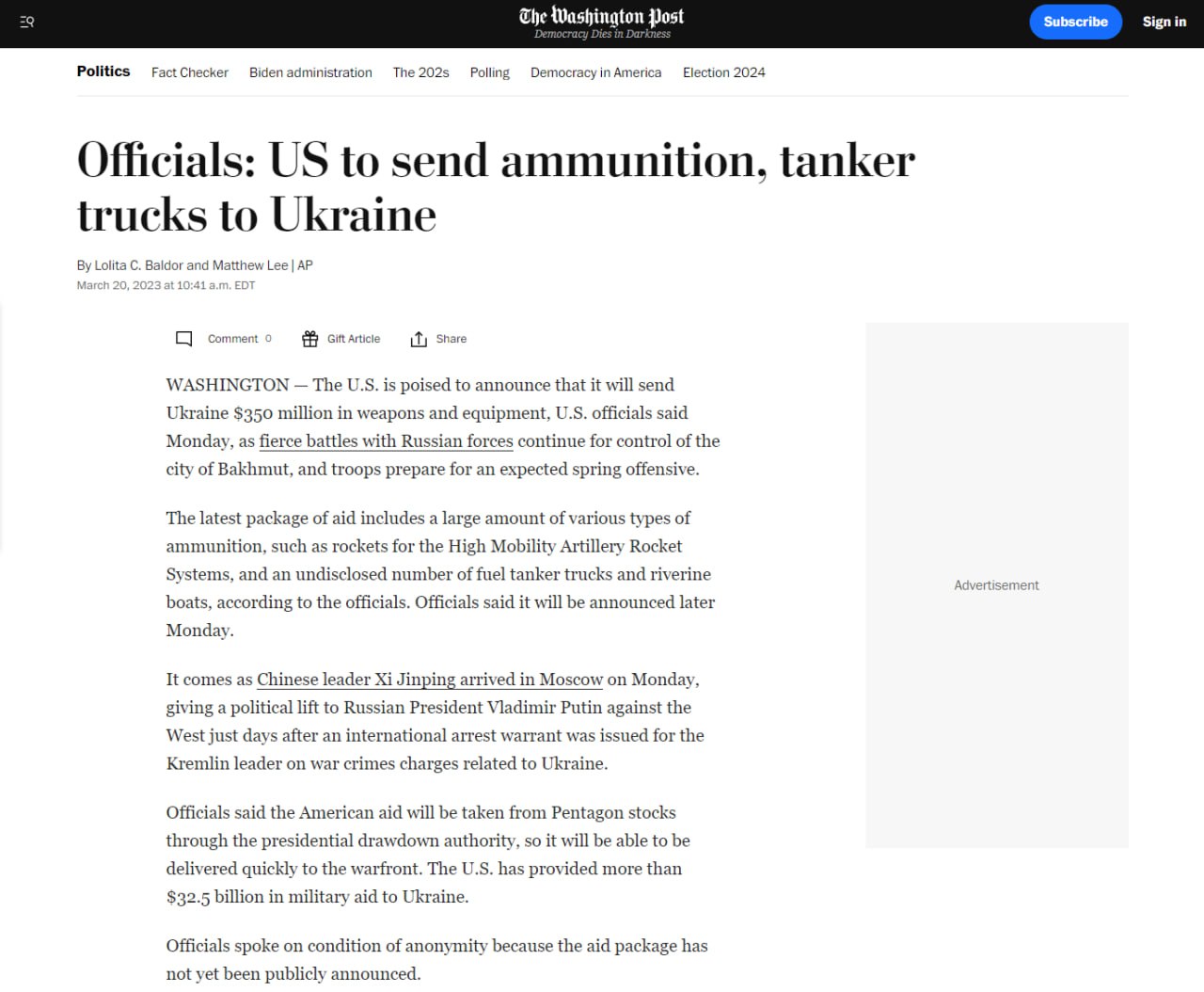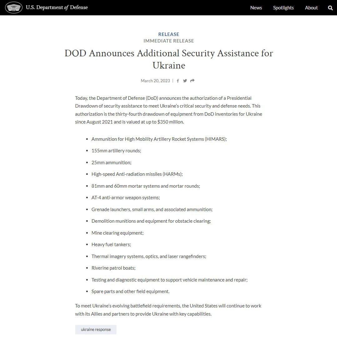 • Прокомментировал план ЕС по поставкам снарядов в Украину стоимостью 2 млрд евро и новый оборонный пакет США стоимостью 350 млн долларов.