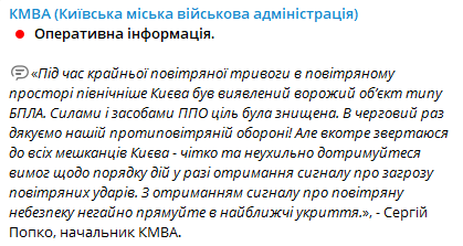 Во время последней воздушной тревоги рядом с Киевом был сбит вражеский беспилотник