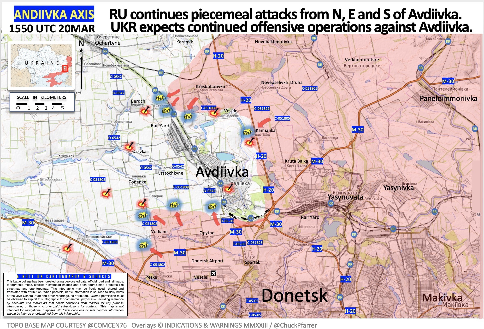 В последние три недели силы РФ постепенно продвигаются вокруг этого укрепрайона, все сильнее угрожая окружением западным линиям снабжения Авдеевки, сообщила сегодня британская разведка. Лондон заявляет, что положение здесь становится похожим на то, что происходит в Бахмуте.