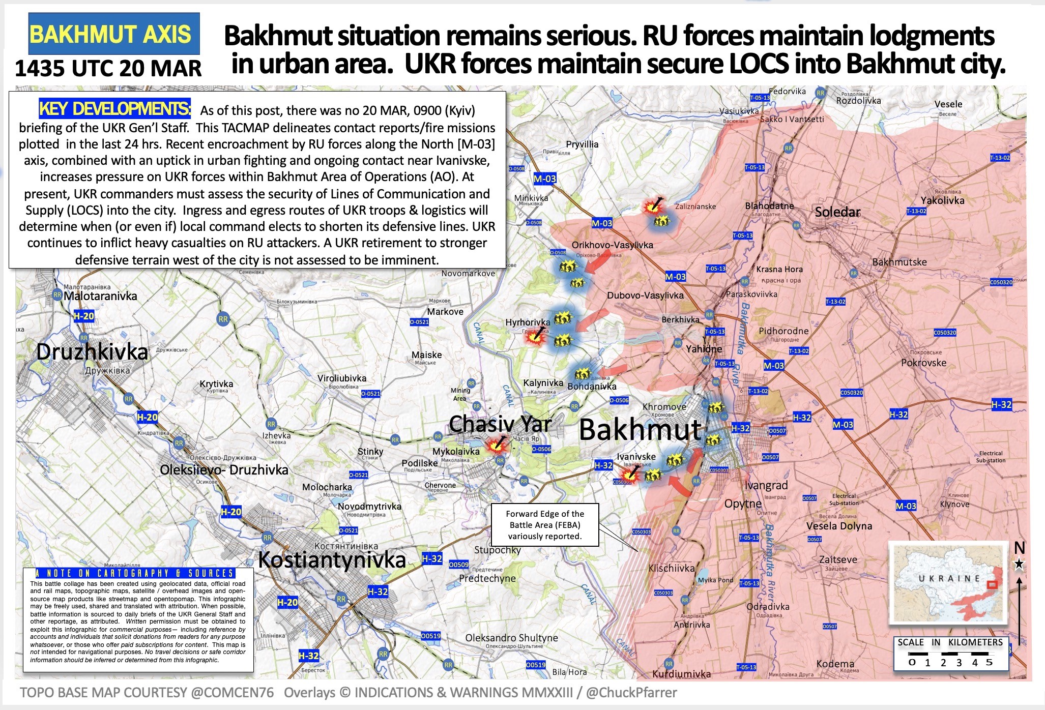 Тем временем куратор ЧВК "Вагнер" Евгений Пригожин утверждает, что по состоянию на 20 марта россияне контролируют 70% территории Бахмута. Украина таких данных не подтверждает.