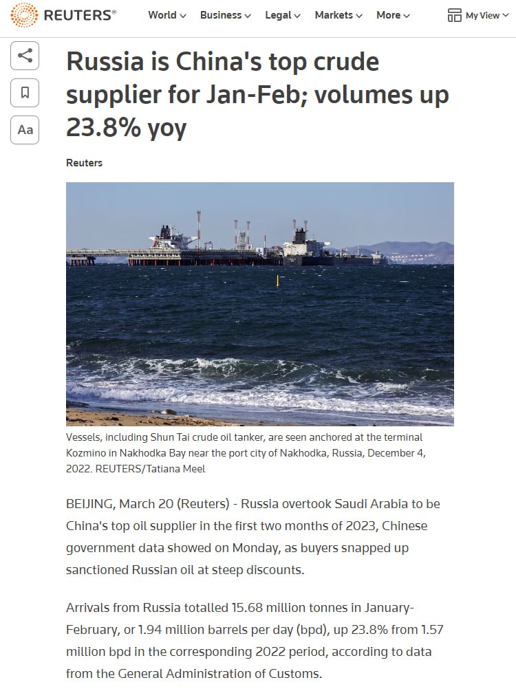 09:30 За первые два месяца 2023 г. Россия увеличила продажи сырой нефти в Китай на четверть и стала крупнейшим поставщиком нефти в КНР, обогнав Саудовскую Аравию, пишет Reuters.