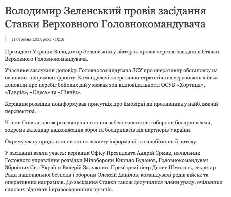 - Рассказал о заседании ставки, где рассматривались ситуация на фронте и поставки боеприпасов.