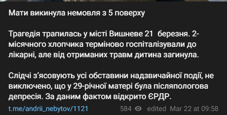"2-месячного мальчика срочно госпитализировали в больницу, но от полученных травм ребенок погиб. Следователи выясняют все обстоятельства происшествия, не исключено, что у 29-летней матери была послеродовая депрессия. По данному факту открыт ЕРДР", - написал Небытов.