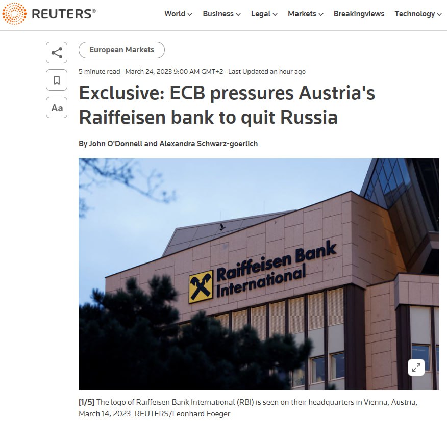 Центробанк ЕС требует от Raiffeisen Bank уйти из России. Давление возникло после того, как высокопоставленный чиновник США по санкциям выразил обеспокоенность по поводу бизнеса Райффайзен в РФ во время визита в Вену в прошлом месяце.