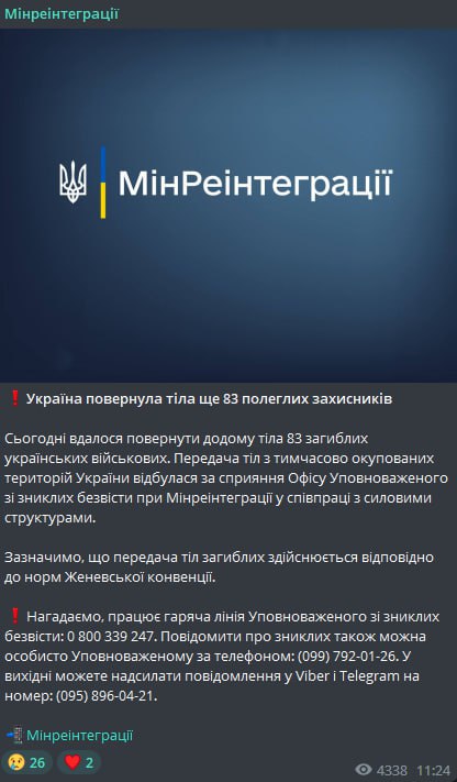 В Минреинтеграции сообщили, что в пятницу, 24 марта, в Украину удалось вернуть тела 83 погибших защитников Украины.