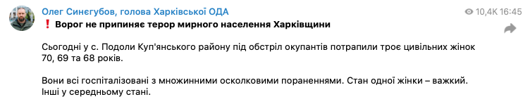 РФ обстреляла село Подолы Купянского района Харьковской области. Ранены три пожилые женщины 70, 69 и 68 лет.