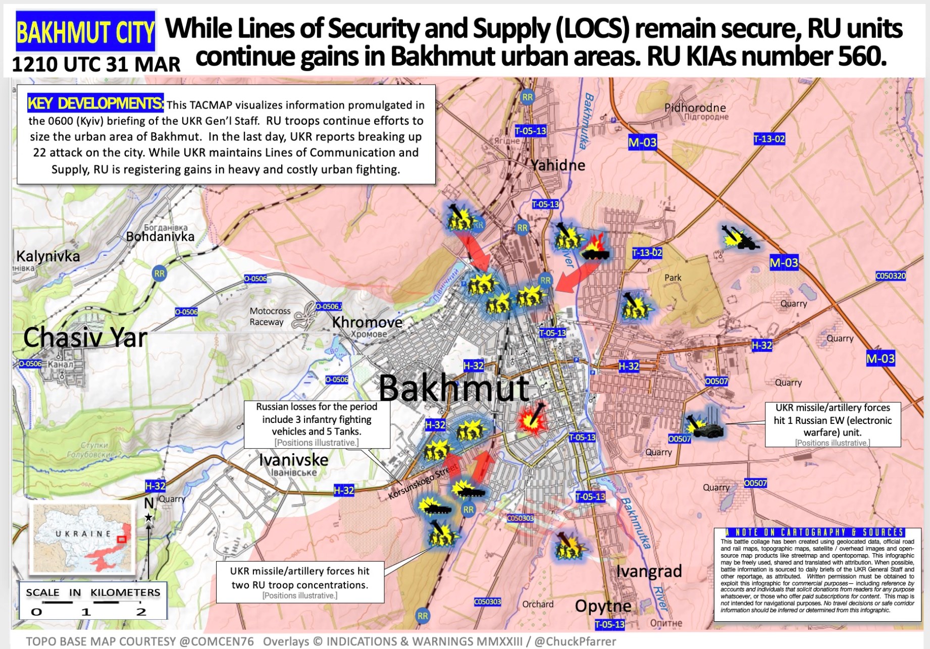 Институт изучения войны пишет, что на видеороликах, поступающих из Бахмута, отражены незначительные успехи "Вагнера" в южной части города. Но в целом там считают, что ВСУ предотвратили угрозу окружения города, а темпы продвижения "вагнеровцев" значительно замедлились.