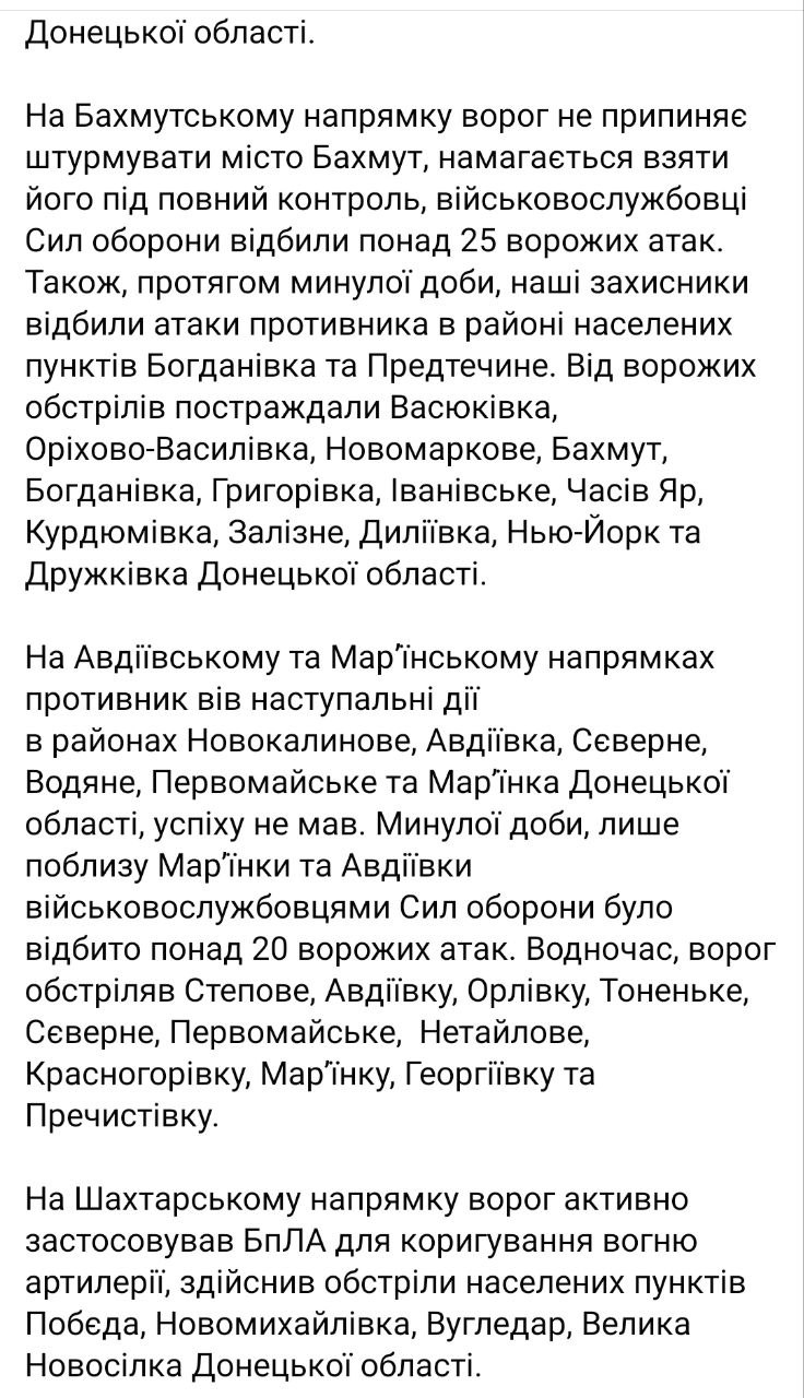 3. На Авдеевском и Марьинском направлениях противник пытался наступать в районах Новокалиново, Авдеевки, Северного, Водяного, Первомайского и Марьинки.