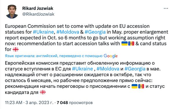 "Европейская комиссия представит обновленную информацию о статусе вступления в ЕС для Украины, Молдовы и Грузии в мае. Надлежащий отчет о расширении ожидается в октябре, так что осталось 6 месяцев, но рабочее предположение прямо сейчас: рекомендация начать переговоры о присоединении с Молдовой и Украиной и статус кандидата для Грузии", - написал Йозвяк.