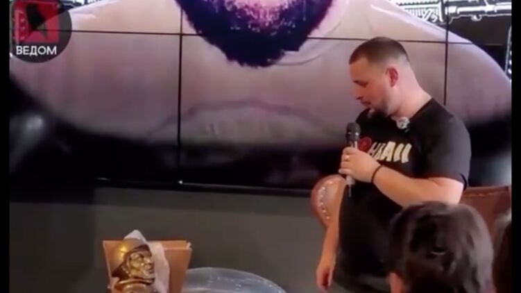 На видео посетитель мероприятия задает Татарскому вопрос о том, что "посты невозможно разрушить потому что их не берут "Калибры". В этот момент Татарский ставит подаренную статуэтку, начиненную взрывчаткой, в коробку и гремит взрыв.