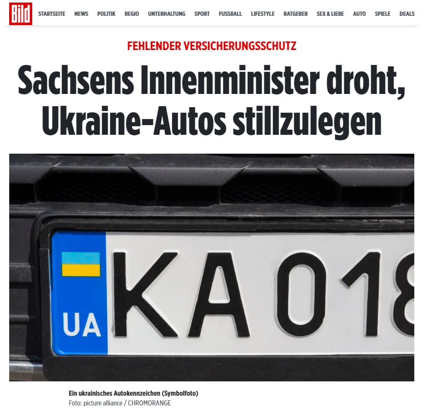 В первые 12 месяцев украинским беженцам с личными авто позволено не регистрировать машины и не получать местные номера, на которые можно купить немецкую страховку. Поэтому они ездят часто на "зелёной карте", либо совсем без нее.