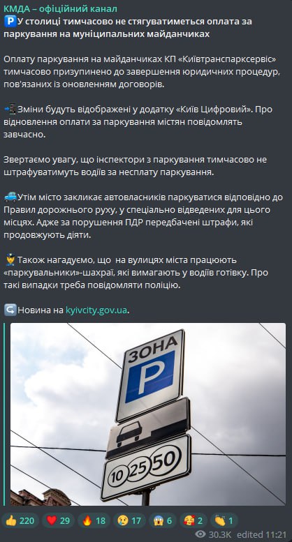 11.40 В Киеве временно не будет взыматься плата за парковку на муниципальных площадках, сообщает КГГА.