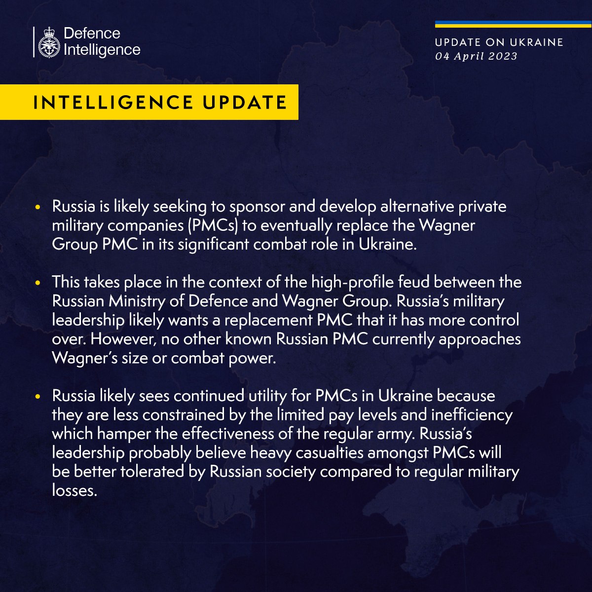 В британской разведке сообщают, что Россия, вероятно, считает ЧВК в Украине по-прежнему полезными, потому что они в меньшей мере, чем регулярная армия, ограничены уровнем оплаты и низким уровнем эффективности.