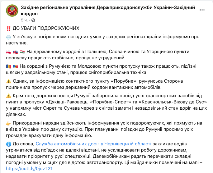 "Дорожная полиция Румынии запретила проезд всех транспортных средств от пунктов пропуска "Дяковцы-Раковец", "Порубное-Сирет" и "Красноильск-Вековая де Сус" в направлении городов Сирет и Сучава в связи со снежными заносами и неудовлетворительным состоянием дорог на этих участках”, - говорится в сообщении.