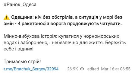 Об этом сообщил спикер Одесской областной военной администрации Сергей Братчук.
