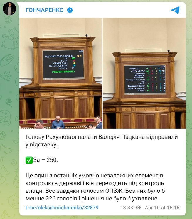 "Это один из последних условно независимых элементов контроля в государстве, и он переходит под контроль власти", - прокомментировал голосование за отставку Пацкана и предстоящее назначение Плиса нардеп Алексей Гончаренко.