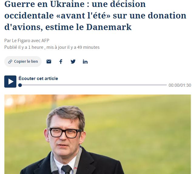 Министр обороны Дании Троэлс Лунд Поульсен не исключил, что решение Запада о возможной передаче Украине боевых самолетов будет принято "до лета" - после поставок МиГ-29 поляками и словаками.