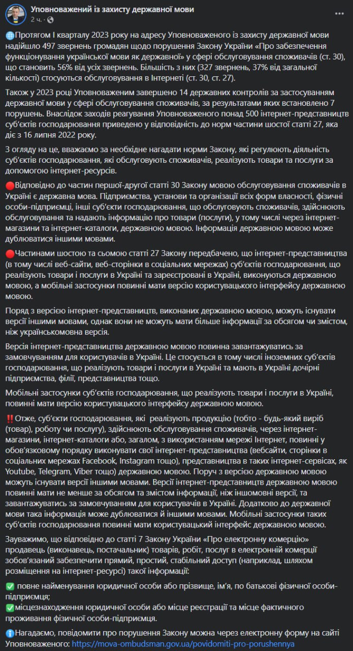"Версия интернет-представительства на государственном языке должна загружаться по умолчанию для пользователей в Украине. Это касается в том числе иностранных субъектов хозяйствования, реализующих товары и услуги в Украине и имеющих в Украине дочерние предприятия, филиалы, представительства и т.д. Мобильные приложения субъектов хозяйствования, реализующие товары и услуги в Украине, должны иметь версию пользовательского интерфейса на государственном языке", - сообщил он.