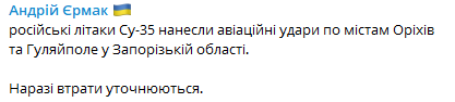 Во вторник, 11 апреля, российские самолеты Су-35 нанесли удары по Орехову и Гуляйполю в Запорожской области.