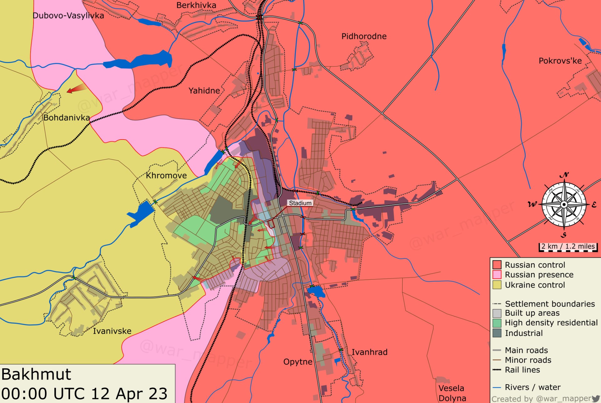 Насколько достоверна карта (учитывая сложные отношения Пригожина с минобороны РФ) неизвестно. Ранее украинские военные неоднократно заявляли, что регулярные российские войска воюют и в самом Бахмуте, и на флангах к западу от него. Отмечая в связи с этим усиление артиллерийских обстрелов.