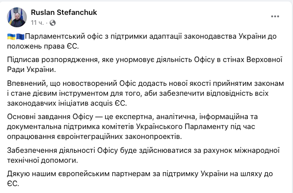 Обеспечение деятельности офиса будет осуществляться за счет международной технической помощи", - сообщает Стефанчук.