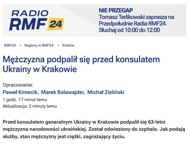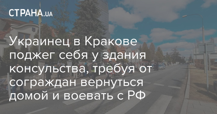 Под зданием генконсульства Украины в Кракове 62-летний украинец попытался совершить самосожжение. Мужчина выкрикивал в адрес собравшихся под генконсульством призывы на украинском языке возвращаться на родину и защищать страну от россиян.