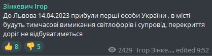 10.10 Во Львов сегодня прибыли первые лица Украины, в городе временно отключат светофоры, но перекрывать дороги не будут, сообщил депутат львовского горсовета Игорь Зинкевич.