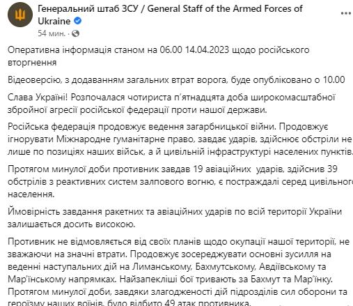 В пятницу, 14 апреля, в Украине идет уже 415-й день войны с Россией