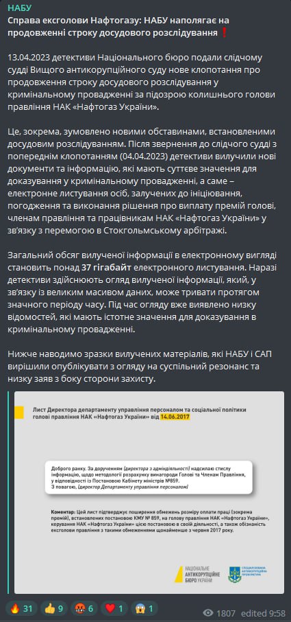 Как сообщает НАБУ, всплыла "электронная переписка лиц, привлеченных к инициированию, согласованию и исполнению решения о выплате премий".