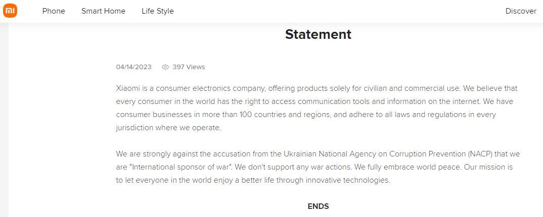 "Мы категорически против обвинений со стороны Национального агентства Украины по вопросам предотвращения коррупции, что мы "Международный спонсор войны". Мы не поддерживаем никакие военные действия. Мы полностью поддерживаем мир во всем мире", — сообщили в компании Xiaomi.