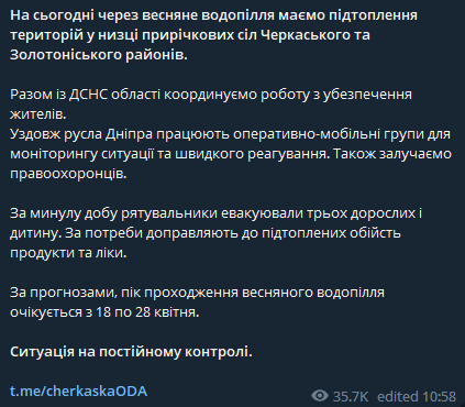 Также в соседней Черкасской области подтоплены села Черкасского и Золотоношского районов, сообщил губернатор Игорь Табурец.