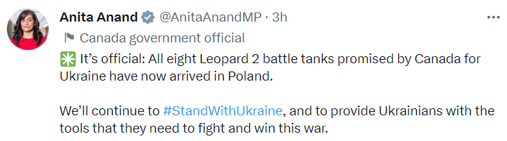 Танки Leopard для Украины прибыли из Канады в Польшу. Фото: Twitter/AnitaAnandMP