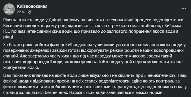 "Этот показатель влияет на качество воды только зрительно и не свидетельствует о ее опасности. Наши специалисты ежедневно отбирают пробы на всех этапах водоподготовки, контролируют физико-химические и микробиологические показатели и гарантируют, что водопроводная вода в столице остается безопасной. Пока качество воды остается в пределах нормы", - говорится в сообщении.