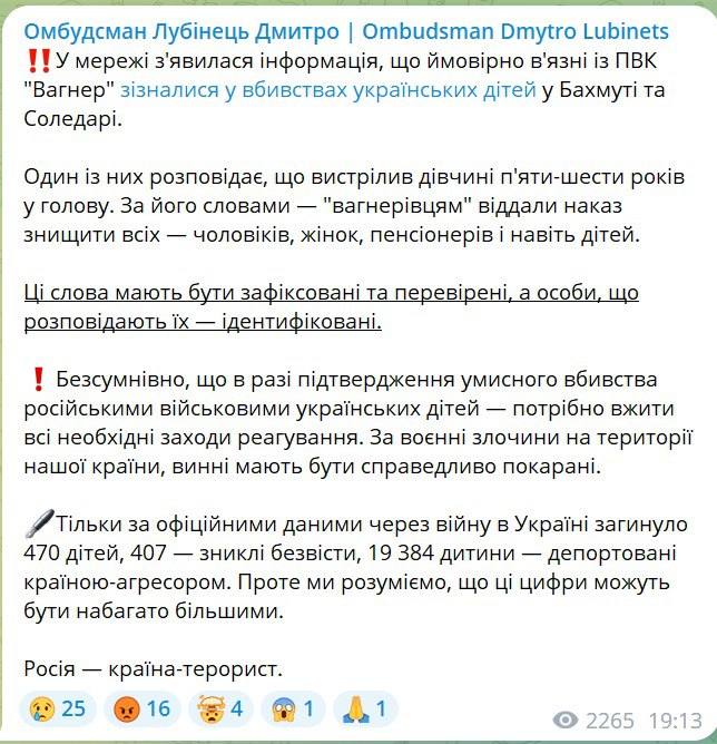 Украинский омбудсмен Дмитрий Лубинец прокомментировал заявления экс-заключенных из ЧВК "Вагнер", рассказавших о массовых убийствах, которые совершали наемники ЧВК в Бахмуте и в Соледаре.