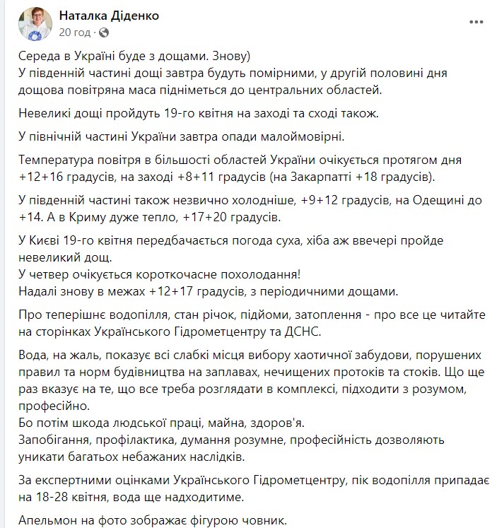 В среду, 19 апреля, в Украине пройдут дожди. В частности, осадки ожидаются в южных регионах, а во второй половине дня они дойдут и до центральных областей. Похолодание следует ожидать уже с завтрашнего дня, 20 апреля.