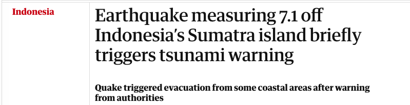 Землетрясение магнитудой 7,1 произошло в 170 км к юго-востоку от Телук-Далама на глубине 15 км, сообщила Геологическая служба США. Афтершоки были силой 5,8 балла.
