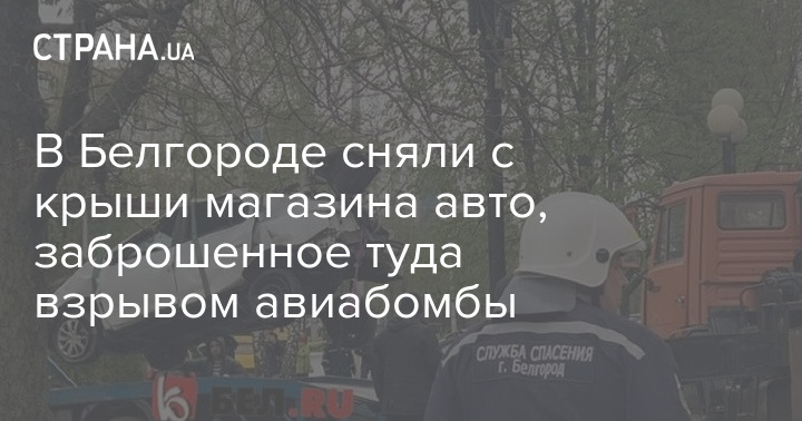 В российском Белгороде с крыши магазина сняли авто, которое вчера забросило туда мощным взрывом. По всему корпусу машины видны сильные вмятины.