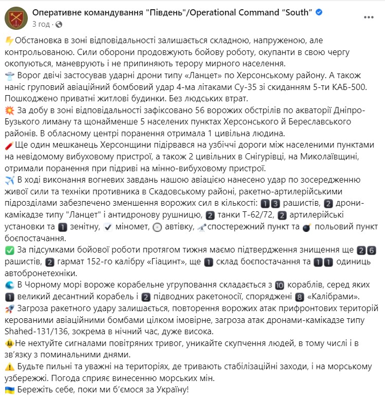 Об этом сообщает Оперативное командование "Юг" в Facebook.